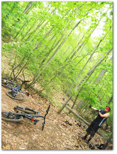 sattys agenda for bike riding fuckabilly was the site of last years ass-kicking, the mahlon dickerson. time heals all, so i wasnt as afraid of the trails as i was a few seconds after a big stump in the trail sent me flying. it had rained earlier in the day, so many of the trails were a bit damp. alot of the trails also seemed somewhat less rocky, and we took many of the trails with relative ease. there were some swampy areas, and i did bail once after losing my balance on a narrow bridge, but overall it was a good ride.