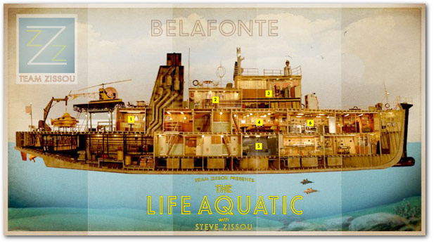 on a more interpretative note, i liked how the narrative of the story lends itself to a bit of uncertainty in regards to what is “documented” and whats “scripted”…since “the life aquatic” actually refers both to the movie and to the documentary team zissou is purportedly making. this is evident from the very first scene with the first half of his “documentary” being screened, in recurring contrasts between whats “on the record” and “off the record”, and especially illustrated nicely in the “tour” of the belafonte…team zissous ship…and how it is literally treated like a cross-sectioned movie set.