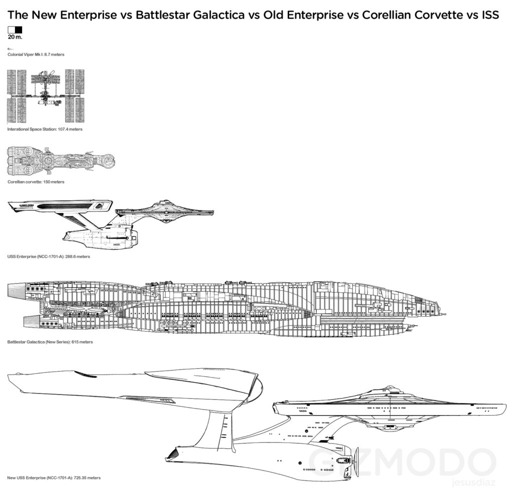 ooh…k, i didnt know this. apparently the new enterprise in jj abrams movie is significantly bigger than the original enterprise. by alot…so much so that its bigger than even the galactica. the nacelles themselves are alone longer than the original enterprise! via gizmodo