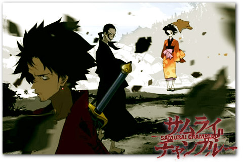 while we’re on the topic of anime, i thought id squeeze this in here. i recently came across the new anime project by renowned anime director shinichiro watanabe, samurai champloo. for those unfamiliar with the name watanabe, you might be more familiar with his last anime series, cowboy bebop, or his two anime shorts from the animatrix, “a detective story” and “kids story”. watanabe jumps back a couple centuries to feudal japan for samurai champloo, which centers around the three main characters mugen, fuu, and jin. while i trust watanabe to always kick much ass, i couldnt help but notice how much samurai champloo resembled cowboy bebop…maybe a little too much. not that theres anything wrong with the style of bebop, i just dont want him beating that style to death. *shrug* ill still check it out tho of course…thats a given. the series will be released in japan may 19th. what the heck is a champloo?