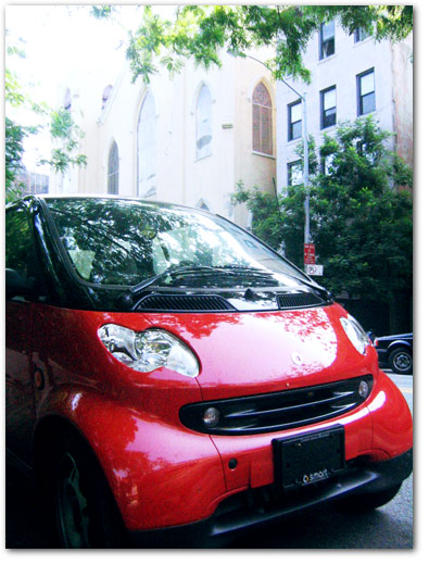 woo…a smart car! taken this morning near the bus stop on ave B. this is probably the first smart car ive seen outside of europe (technically the car had a montreal license). i just thought id just share this.