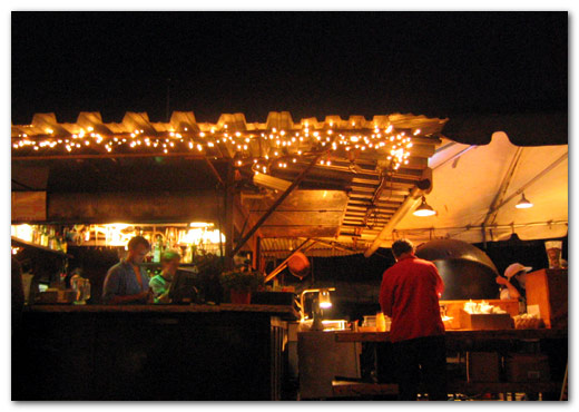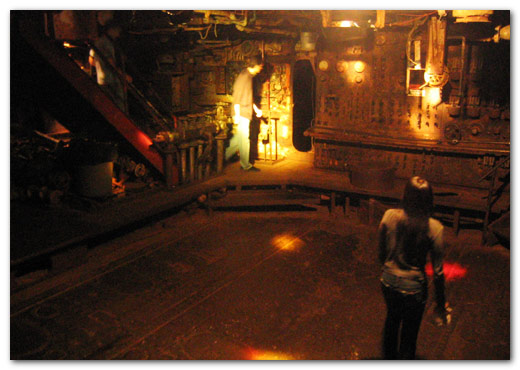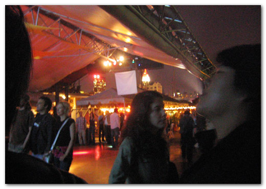 the party was pretty coo. not many people, but the dj was rockin’ it with his dual powerbooks and trippy visuals. and the place itself…word, so coo yet creepy. the spiewak party was being held on the docks, but the other half of the frying pan was actually an old docked ship which you could head into. the ship had supposedly sunk, and was eventually raised…so the interiors were all decayed and rusted. with the ship rocking in the water, and the hanging lights casting shadows as they swung back and forth, it could get pretty creepy at times.