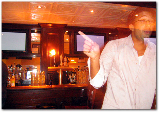 satty nite was marisol and minks guest bartending gig at black finn. so a few of us braved midtown east to go and harass them as surly bar-people. black finn turned out to be a sports bar…a nice one at that with plasma screens everywhere, and even little tvs in each booth. craziness. the cardinals/red sox game was on, so the place was packed with crazy people hollering things about who rocks and who does not. i love sports. my first round of drinks was the obligatory gimlet, which m made pretty well. i then got her to make me my weapon of choice…the infamous william tell, which was a propietary drink only stellas (at cornell) served. and it tasted pretty good til i realized later that when i told her the ingredients, i kind of left out citron. damnit, no wonder it tasted like non-alcoholic candy. the drinks for the rest of the nite were basically me trying to get the william tell perfected (fyi, its supposed to taste like apple sidra)…4 drinks later. bah, what a motherfucking particular drink. anyhoo, stumbled home around 3:30ish…super.