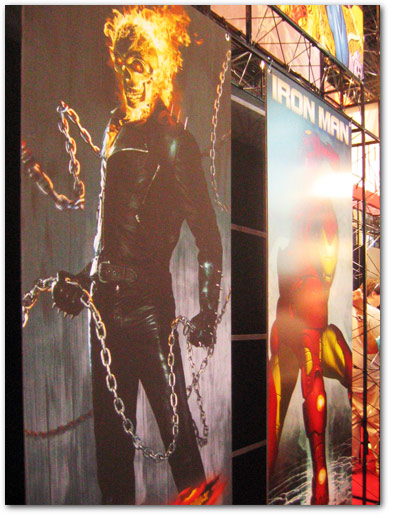 > banners at the marvel booth. the ghost rider banner looked like a touched up photo. promo for the upcoming movie maybe?