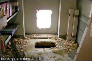 woo…so ive jus been informed one of our offices was broken into last nite. go east williamsburg! one of our offices on the far end of the street (above a hardware shop) was broken into…apparently to try and get into the shop below. i dont necessarily condone theft, but shit…these guys were stupid. first off…why a monday? what shop has excess money on a monday?? second off, they tried punching holes thru our floor-plate to get to the shop below. a floor plate…good job. they then knocked out a wall instead in our stairwell to get into their store and made off with what someone told me was in the excess of “some coins.” good job boys. then when they tried to get out, they decided to try and tear thru some more walls (as opposed to jus going back upstairs and out where they came in) and fucked up our downstairs bathrooms and storage closets. so lets assess their take. minus 1 ladder (how they crossed from the adjacent building to ours)…abt $100 (mebbe stolen). minus alot of back-breaking work…future back problems. plus “a few coins”…enuf to pay for tomorrow’s coffee. this adds up to….a whole lot of stupidity. super.